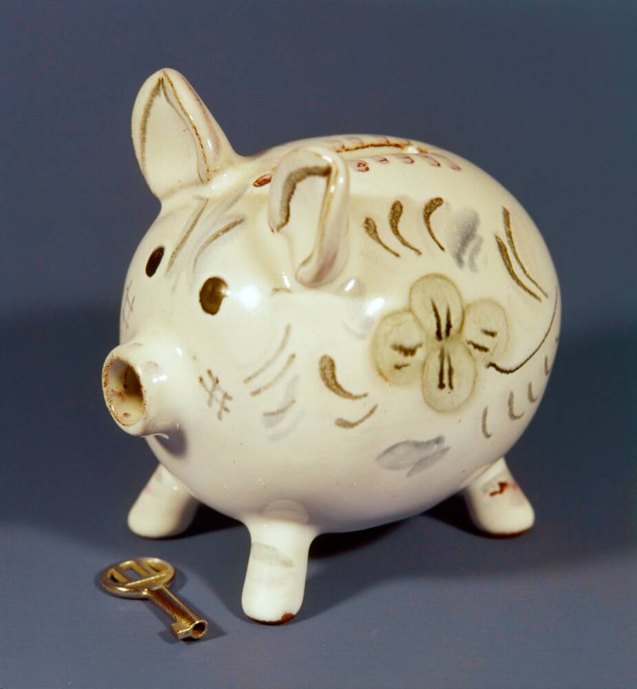 Het spaarvarken op de foto komt uit de fotocollectie van het Nationaal Archief. Het is een speenvarken dat op slot kan. Een hamer was niet nodig: het sleuteltje ligt ernaast. Fotograaf: W.L. (Pim) Stuifbergen / Spaarnestad Photo (05887), 1964.